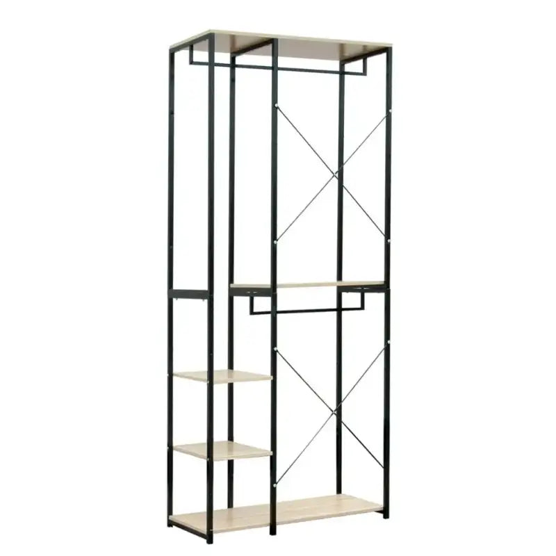 Het BukkitBow dubbel kledingrek en kapstok combineert wit stalen buizen met eikenhout voor een moderne uitstraling die perfect past bij elke interieurstijl. Met twee kledingrails, drie kledinghangers en drie planken biedt dit meubelstuk voldoende ruimte voor het organiseren van kleding, schoenen en accessoires. Met afmetingen van 90 x 40 x 204.5 cm (L x B x H) is dit kledingrek ruimtebesparend en praktisch, waardoor het ideaal is voor gebruik in slaapkamers, gangen of kledingwinkels.