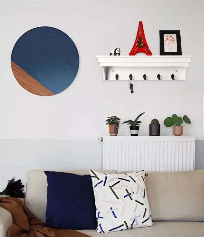 Deze muurplank / kapstok is niet alleen een decoratieve toevoeging aan elke kamer, maar ook zeer functioneel. Gebruik het om boeken, tijdschriften, foto's en andere decoratieve items weer te geven, terwijl de 5 haken je in staat stellen om jassen, tassen, sjaals en meer op te hangen. Of het nu in de slaapkamer, woonkamer, babykamer of elders is, deze muurplank biedt een veelzijdige en stijlvolle oplossing voor het organiseren van je ruimte.