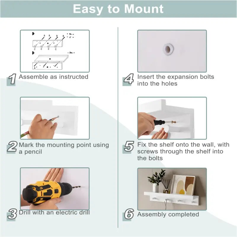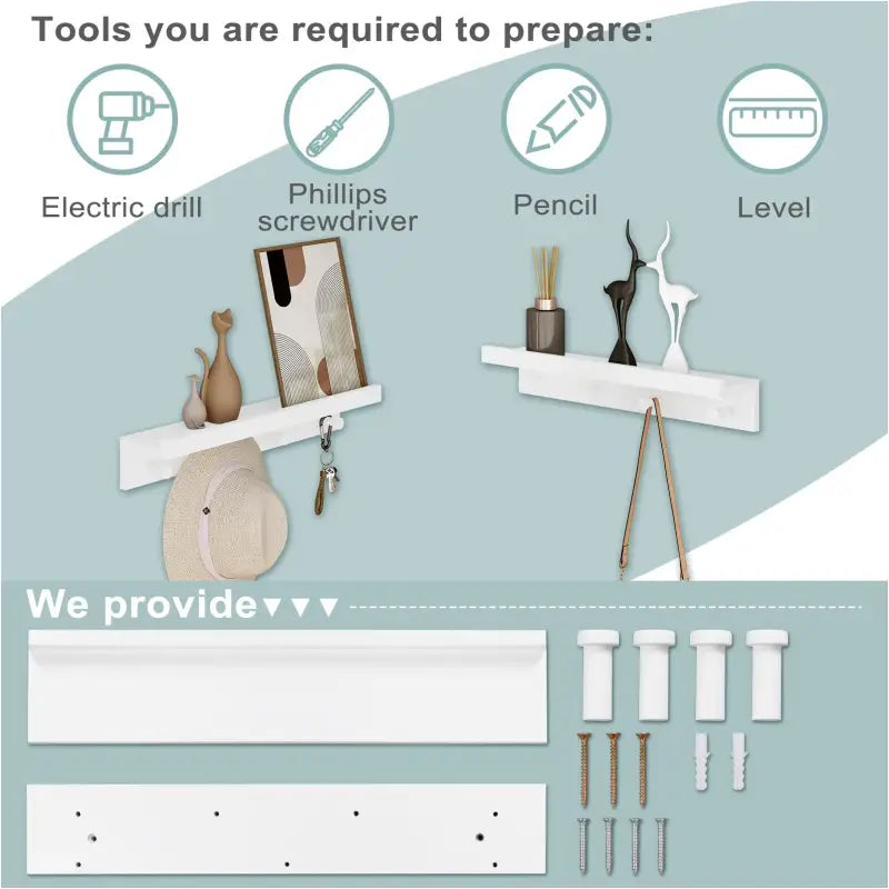 Dankzij de wandmontage bespaart u vloerruimte en geniet u van een naadloze installatie. Met inbegrepen instructies en accessoires is de montage eenvoudig en snel. Deze witte zwevende plank met 3 haken kan veelzijdig worden gebruikt als opbergrek voor sleutels, tassen, decoratieve items of zelfs in de keuken voor extra opslag. Esthetisch en praktisch, deze wandplank voegt functionaliteit toe aan elke ruimte.