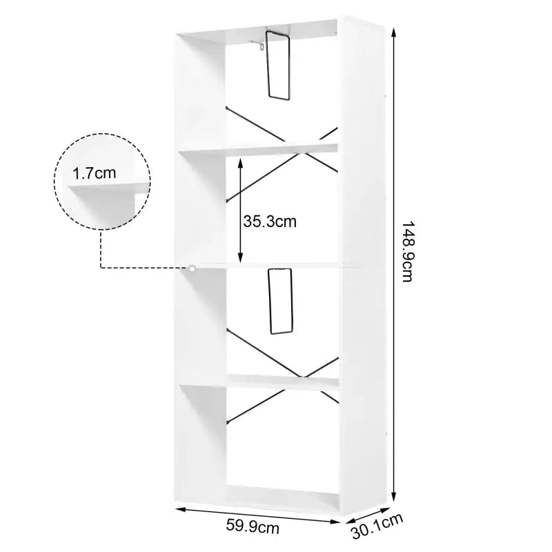 Der Zusammenbau dieses 4-stöckigen Bücherregals ist einfach und wird mit bebilderter Anleitung, Zubehör, Werkzeug und Kippschutz geliefert. Dadurch können Sie den Schrank schnell und einfach montieren. Die Vielseitigkeit dieser Speichereinheit macht sie ideal für eine Vielzahl von Anwendungen. Egal ob Sie Bücher, Kleidung, Taschen oder Dekoartikel aufbewahren möchten, dieses Bücherregal bietet die perfekte Lösung.
