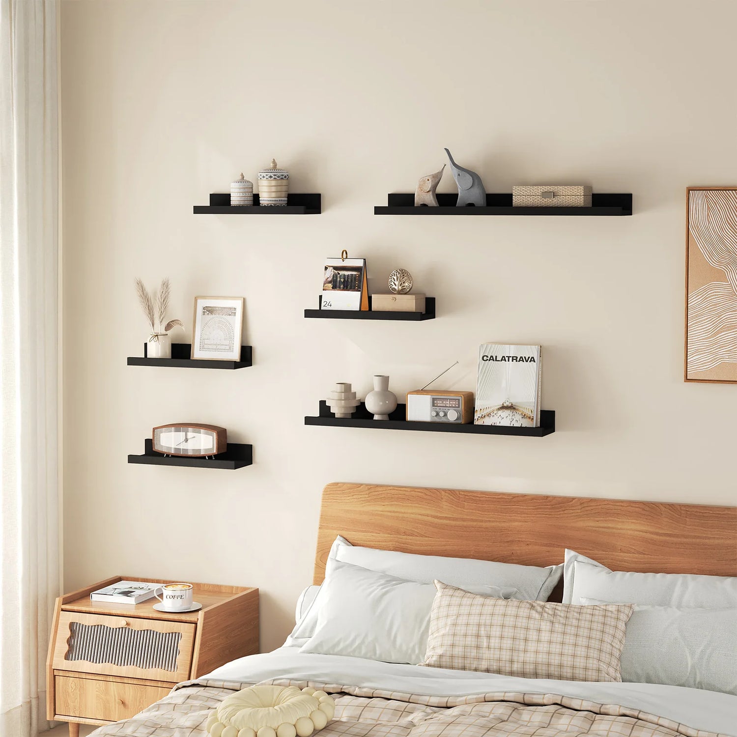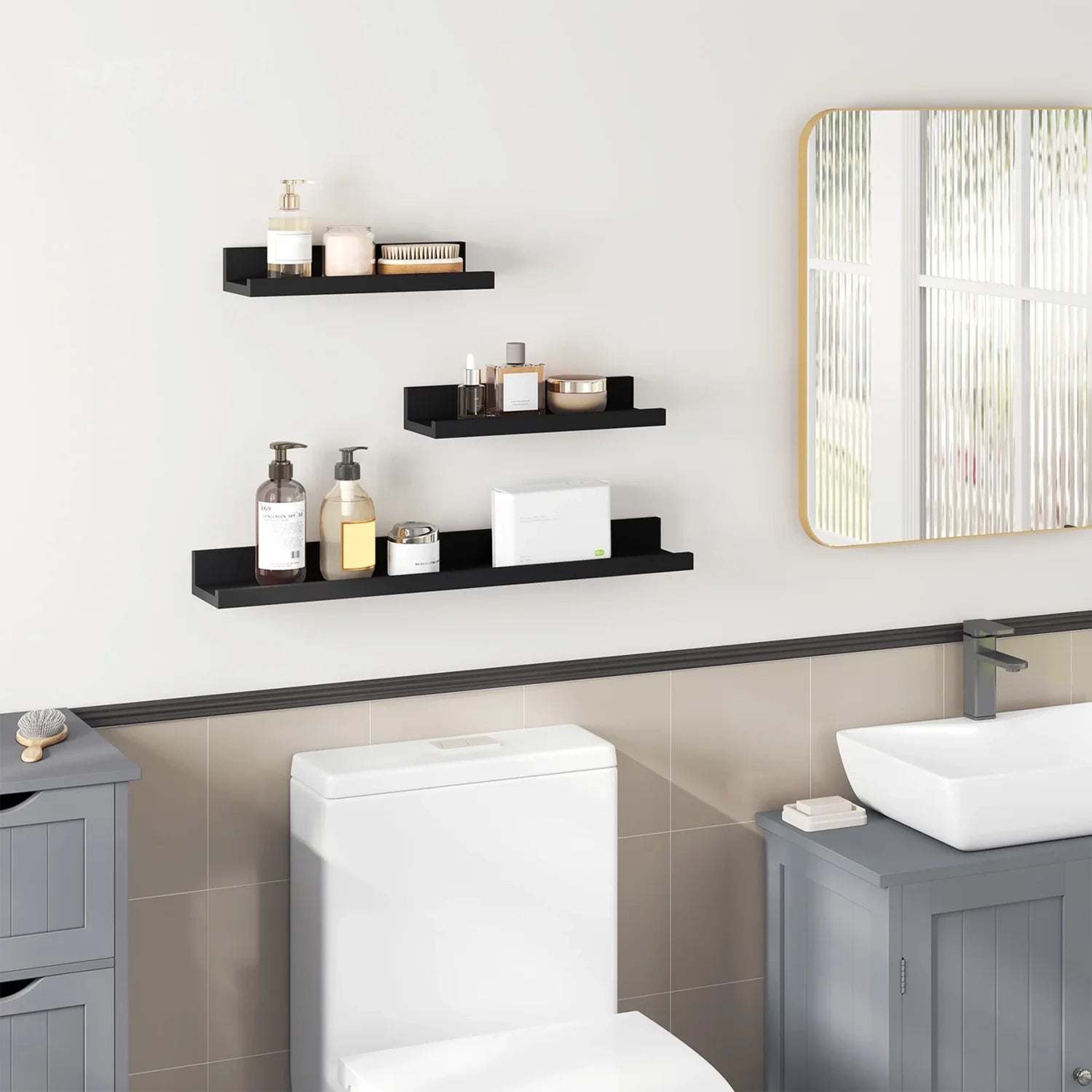 Heeft u moeite om een mooie plek te vinden voor uw decoraties zonder dat uw interieur rommelig oogt? Deze luxe set van drie zwarte wandplanken biedt de perfecte balans tussen functionaliteit en modern design. Of u nu een kale muur wilt opvrolijken of extra opbergruimte nodig heeft, deze zwevende wandplanken creëren direct een georganiseerde en luxe uitstraling. Dankzij het minimalistische ontwerp en de diepzwarte afwerking transformeren deze planken uw wand tot een persoonlijke tentoonstelling van fotolijsten en accessoires, terwijl ze nauwelijks ruimte in beslag nemen.