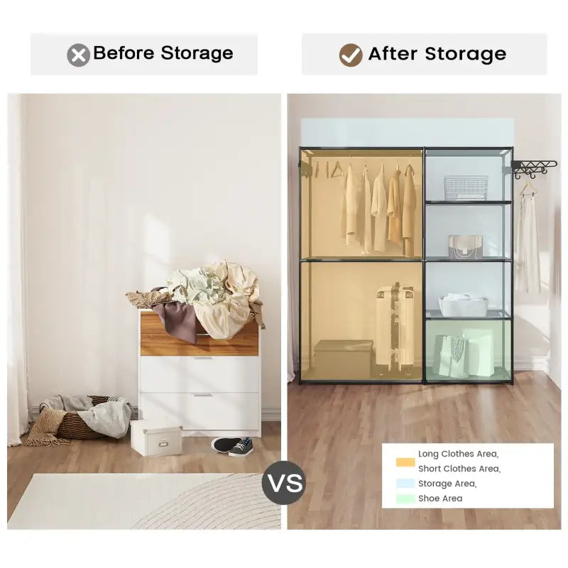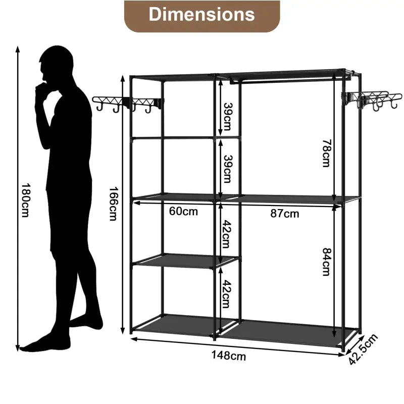 Durch die offene Gestaltung und Unterteilung des Stauraums können Sie schnell Ihr Outfit auswählen und wertvolle Zeit sparen. Dieser vielseitige Kleiderständer passt mühelos in jeden Raum, sei es Schlafzimmer, Wohnzimmer, Ankleidezimmer oder Flur. Dank der ausführlichen Anleitung und den mitgelieferten Anschlüssen lässt es sich leicht auf- und abbauen und eignet sich daher sowohl für die dauerhafte als auch für die vorübergehende Lagerung.