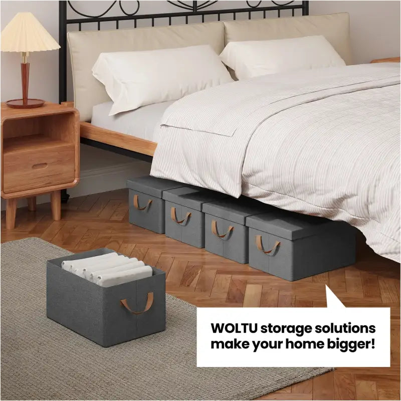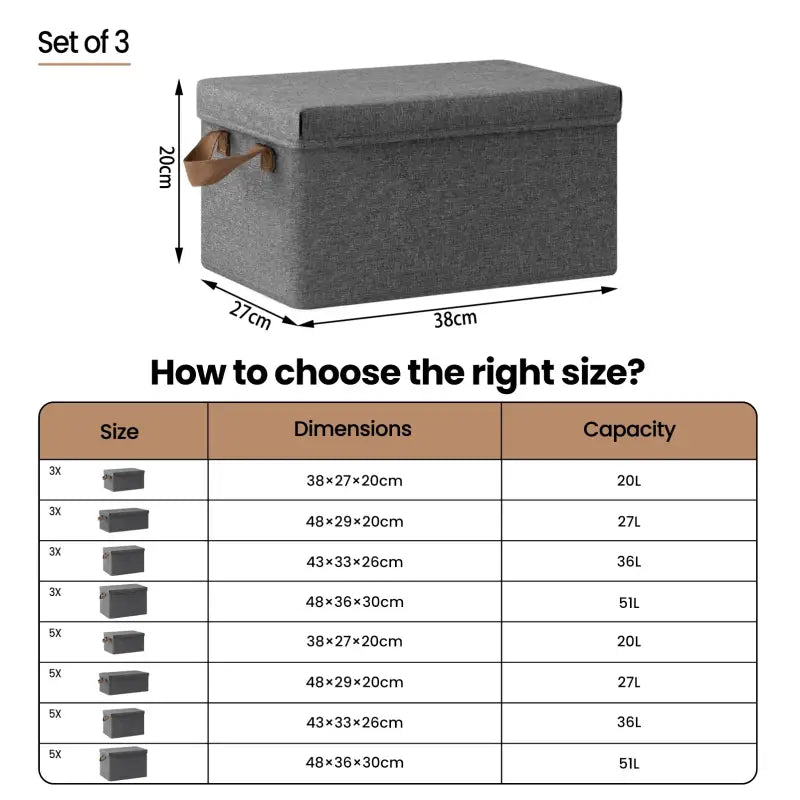 Jede Aufbewahrungsbox ist mit einem praktischen Deckel ausgestattet, den Sie öffnen können, um leicht auf den Inhalt zuzugreifen oder Ihre Sachen vor Staub und Schmutz zu schützen. Dank der praktischen Griffe ist das Bewegen der Boxen ein Kinderspiel, sodass Sie sie bei Bedarf mühelos neu organisieren können. Das Design ist durchdacht und besteht aus atmungsaktivem Polyestergewebe, das reiß- und abriebfest ist, während die Kunststoffbodenplatte dafür sorgt, dass die Box stabil bleibt, ohne an Gewicht einzubüßen.