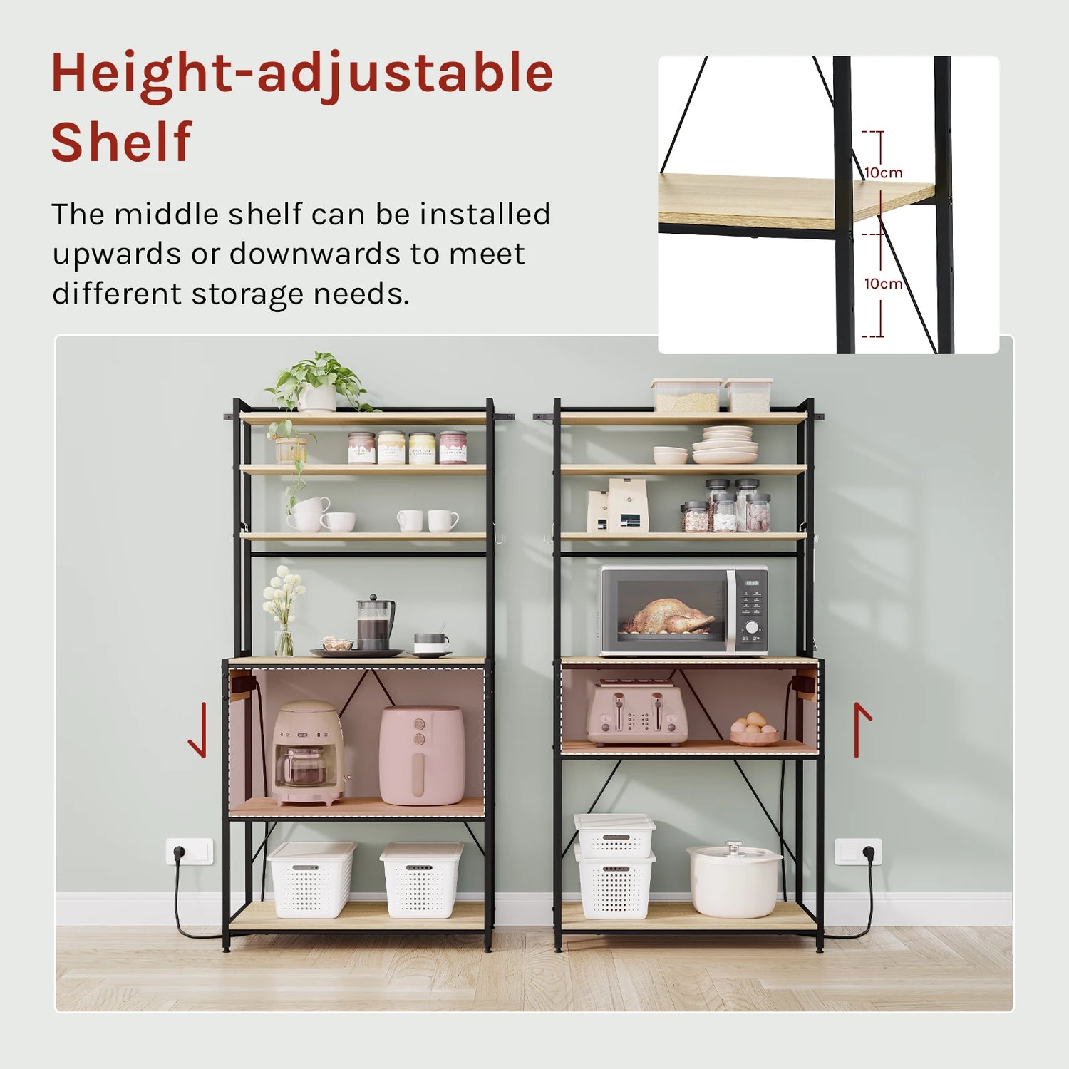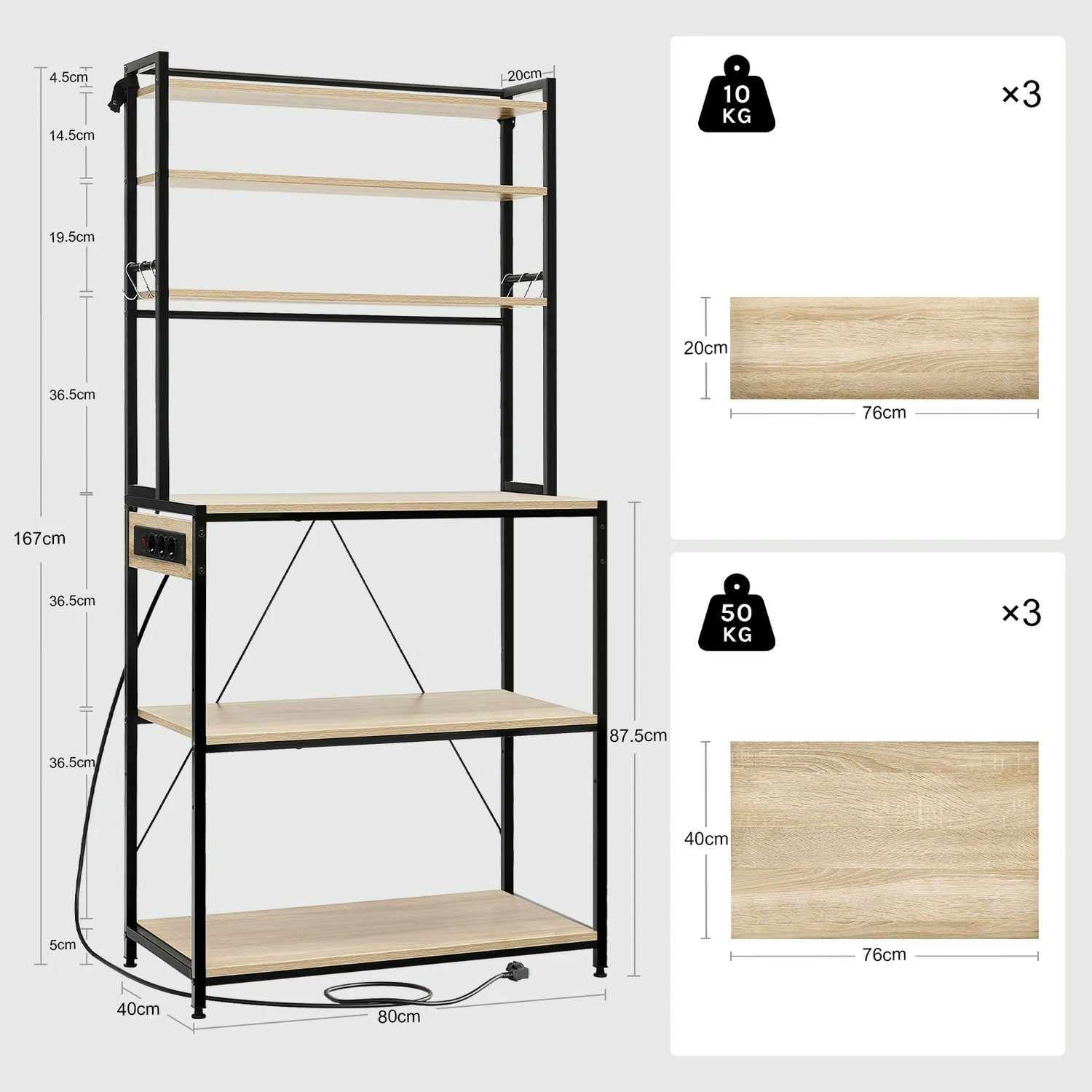 Met maar liefst zes open planken (verdeeld in drie grote en drie kleine niveaus) biedt dit magnetronrek met stopcontact een zee aan ruimte voor al uw voorraad en apparatuur. Een slim detail is de in hoogte verstelbare onderste plank, waardoor u ook grotere items zoals een keukenmachine of hoge voorraadpotten moeiteloos kwijt kunt. De robuuste constructie van gepoedercoate metalen buizen, versterkt met diagonale schoren, garandeert een indrukwekkende stabiliteit. De legplanken van hoogwaardig E1-spaanplaat zijn dankzij het melamine fineer niet alleen krasbestendig, maar ook volledig waterproof en zeer eenvoudig te reinigen.