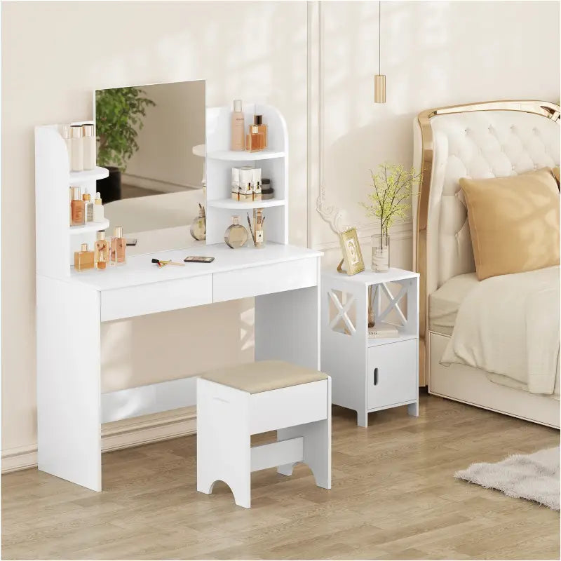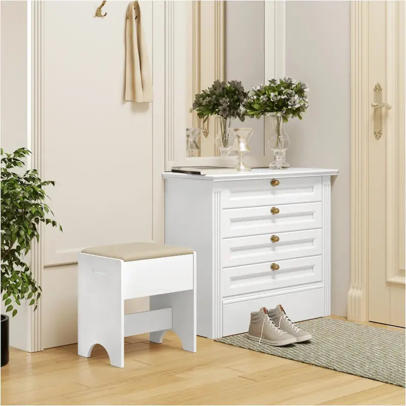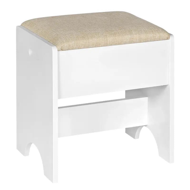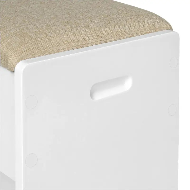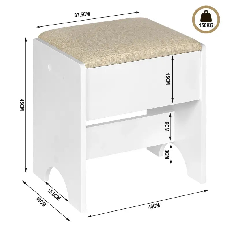 Met zijn neutrale kleur kan deze kruk eenvoudig worden gecombineerd met verschillende kaptafels of inrichtingsstijlen. Het compacte formaat van 40 x 45 x 30 cm en het lichte gewicht van ongeveer 5.2 kg maken het gemakkelijk om de kruk te verplaatsen. Met handgrepen aan beide zijden is het verplaatsen een fluitje van een cent. De witte en beige afwerking voegt een vleugje elegantie toe aan elke dressingruimte of slaapkamer. De kruk wordt geleverd met een geïllustreerde montagehandleiding en een montageset, zodat de montage snel en eenvoudig is en u deze direct kunt gebruiken.